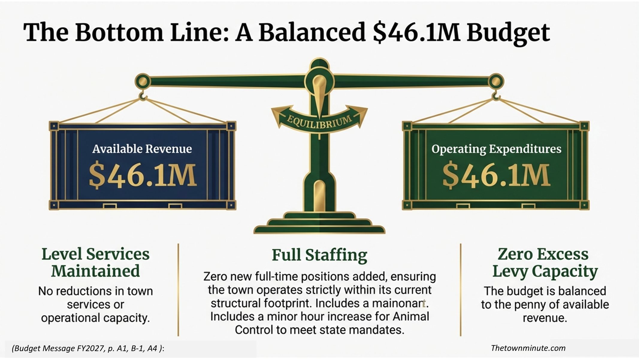 It is worth noting what did not get cut: no reductions in town services, no layoffs, and no department operating below current capacity. The budget describes this as a deliberate outcome - "maintaining services responsibly, without expansion." (Budget Overview Fiscal Year 2027, p. B-2)