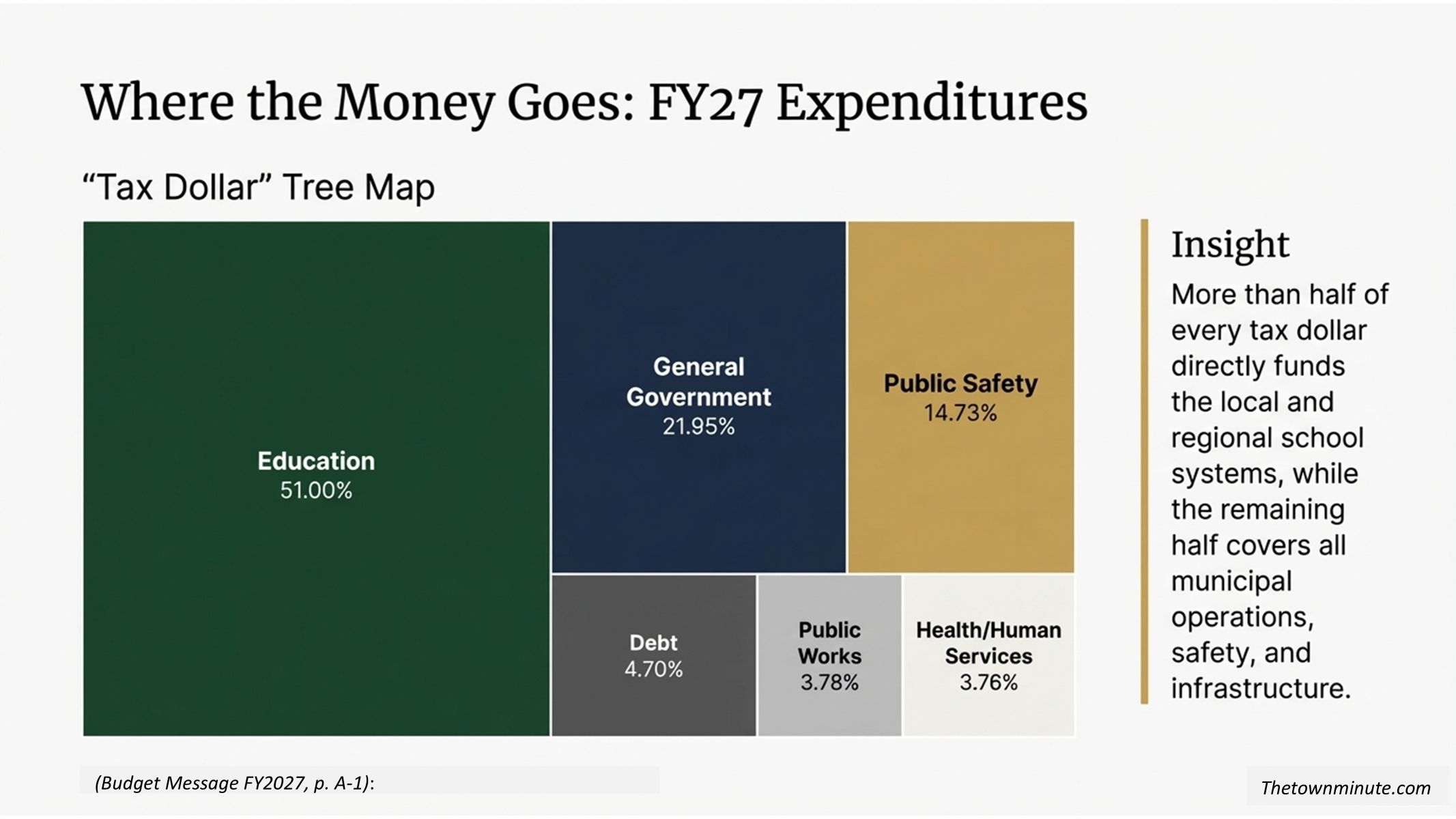 More than half of every tax dollar goes directly to education. Burgess Elementary accounts for $14,360,650 (31.1% of the total budget, up 2.1% from FY26) and Tantasqua Regional accounts for $9,182,998 (19.9%, up 3.8%). (Detail Budget Index, p. C-8; Budget Summary Breakdown)